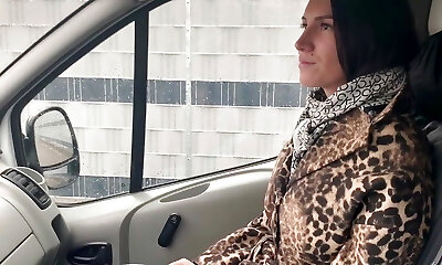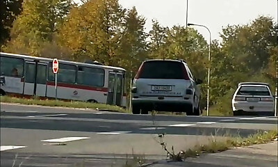 A young woman on the way gives in her narrow rump on the road in the car