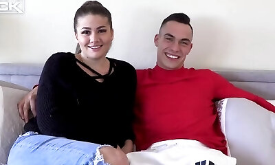Plump casting babe with big natural boobs Teen Katie is masturbating cooter before sex on a table