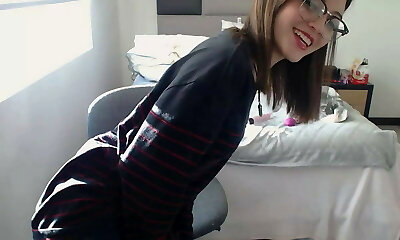 Nerdy Glasses Black-haired Records for her Fans a Panty Try on Drag