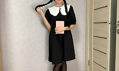 Wednesday Addams In Goth Deep-throat Technique! Impressive Ponytail Plunging Throatpie Cumshot!