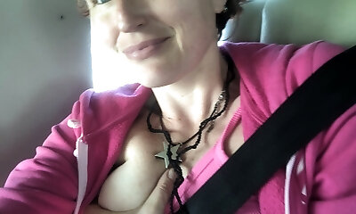 Sexy and busty hot brunette stunner with a jacket and nothing underneat no boulder-holder no panties shows her pussy and bare backside