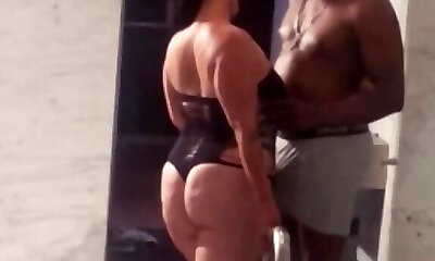 深色头发的拉丁激烈手套她的家伙在洗澡和磅他在亚马逊的姿势