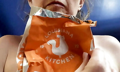 安慰吃! 伤心欲绝的雷切尔*瑞格勒(Rachel Wriggler)在下午6点吃Popeyes早餐时挣扎着忍住眼泪
