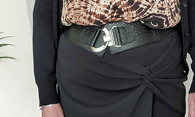 穿着衬衫,裙子,长袜和高跟鞋上班。 准备好让我的年轻老板检查我成熟的乳头,屁股和秃头的阴部。