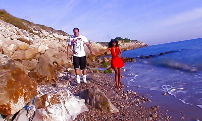 潘下车奇妙的黑头发的摩洛伊斯兰解放阵线在超级淘气的海滩湖边户外。 赤裸裸的海滩. Frigging潮湿cooter性高潮喷